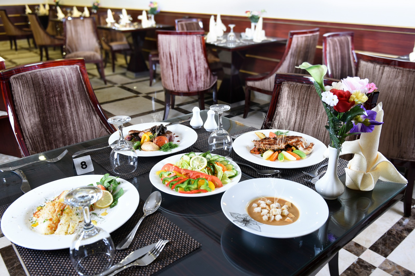 Enjoy a variety of dining options, from international cuisine to traditional Middle Eastern dishes, all prepared with care by our professional chefs
